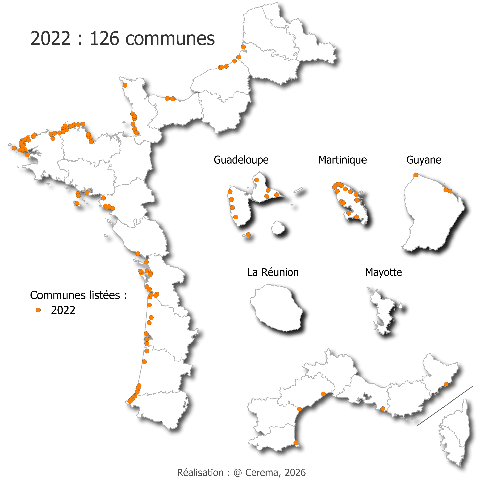 En application de la loi Climat et Résilience, le premier décret du 29 avril 2022 est complété au fil de l’eau : le décret du 13 février 2026 compte 54 nouvelles communes, pour un total de 371 communes littorales.